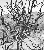 There’s a rugged little stream course between me and the rock; along with a field choked with wild oat and dense with spiny thickets eager to rip at my clothing and flesh. The fire-scarred ground beneath my feet is pocked with holes in which once grew oaks and digger pines; their stumps reduced to ash even well below the surface. Each hole is an ankle waiting to be twisted and I’ve only got two ankles. I’m hiking alone and it’s a mile back to the Subaru. This is why the Forest Service wisely closed the area.