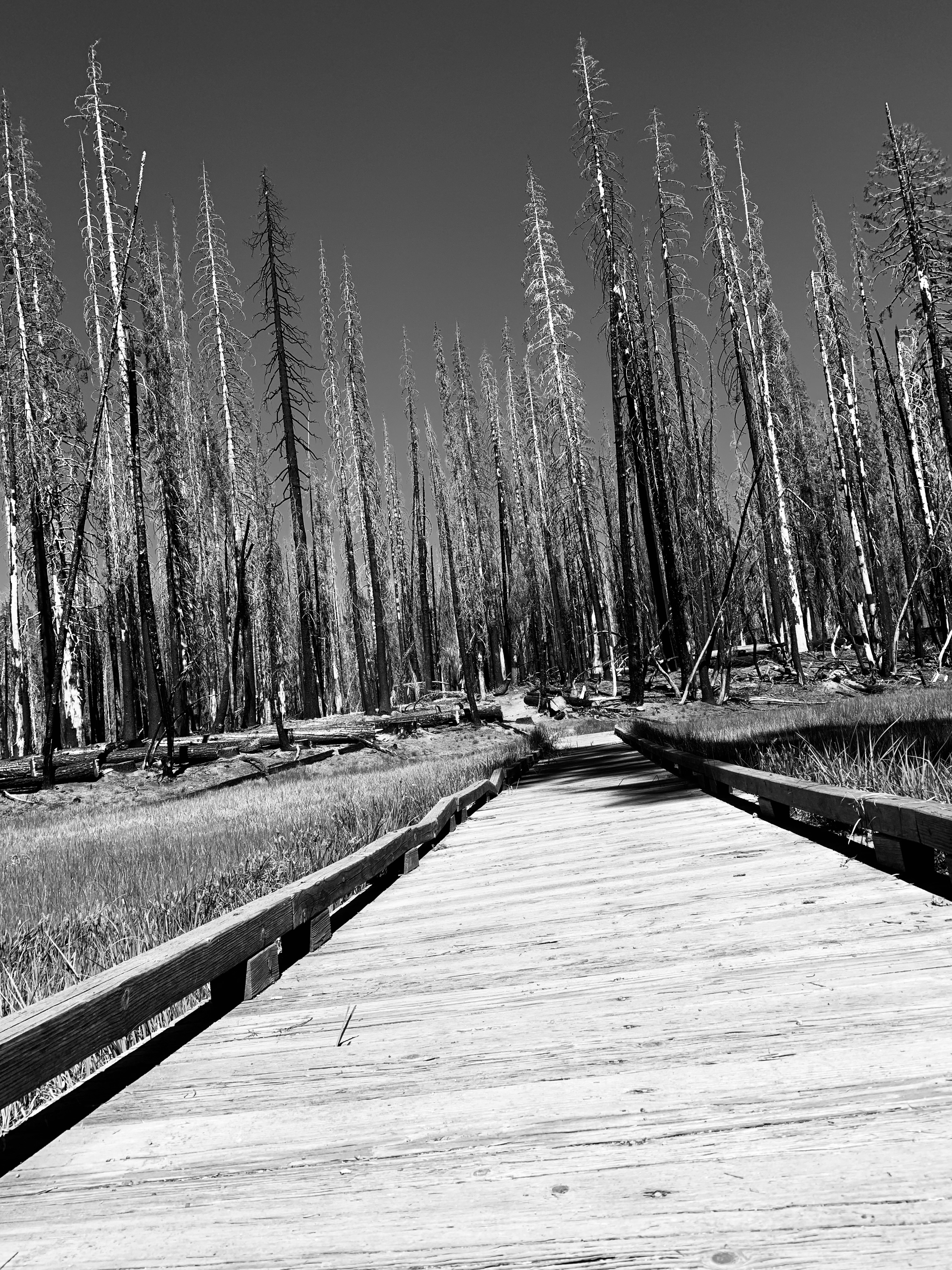Almost. Across the meadow beyond the bridge, the pine forest was a collection of denuded stumps and spikes, victims of 2022’s Dixie Fire which started forty miles away over ridges and down canyons.
